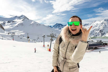 Young adult beautiful happy attractive caucasian smiling hiker woman leaping jumping high like star against skiing resort panorama breathtaking view. Winter travel welcome concept. copy space