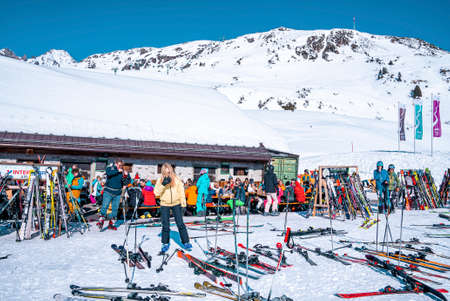 Skiers resting at a restaurant in Tirol, Solden, Austria