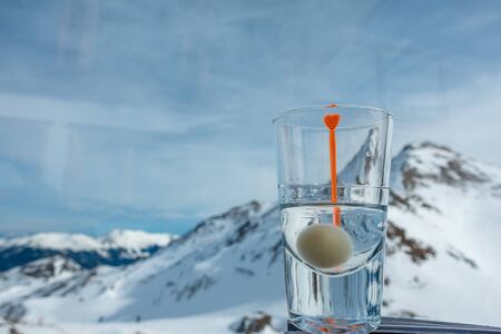 on a table stands a glass with alcohol and in the background are the snow-covered mountains