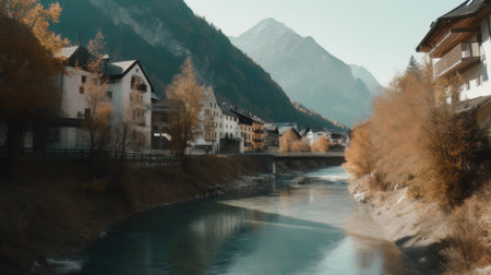 A picturesque winter scene of a small village nestled in a snowy valley, with smoke gently drifting from chimneys, indicating warmth and life within the homes.