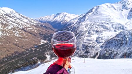 Close up of glass with red wine over landscape of caucasus mouintains in sunny day, Elbrus
