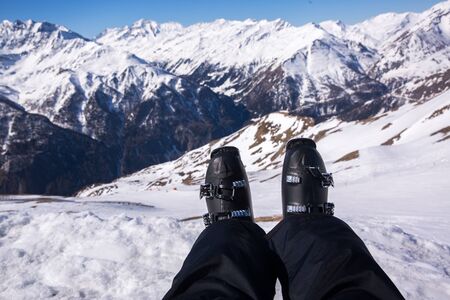 Feet selfie of skier resting and enjoying the view of mountains. Austria, Alps. Winter season