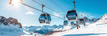 Ski lifts in the Alp mountains, Tirol, Austria. Bright blue sky and mountain covered with snow.