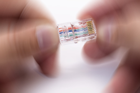 Hand holding lan cable for plug to laptop