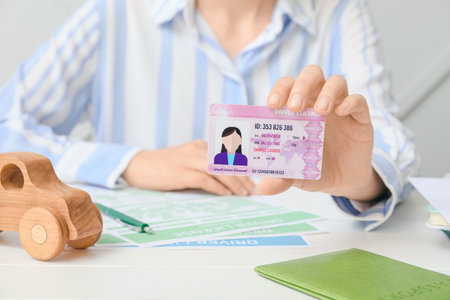 Woman driving license and application form at table