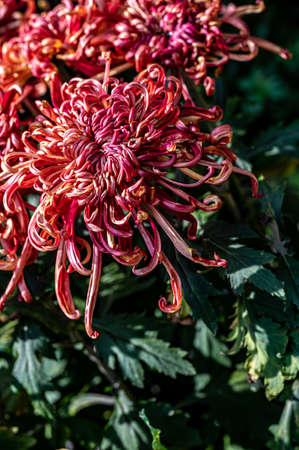 Beautiful colorful chrysanthemums in a closed Japanese garden. Close-up. Vertical