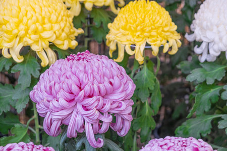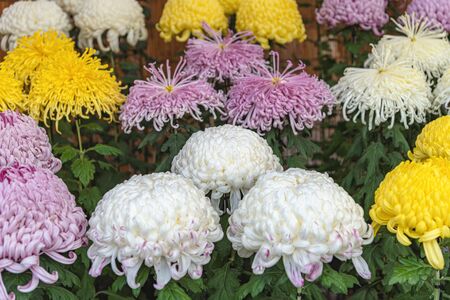 Colorful Japanese chrysanthemums flower blooming beautifully with fresh abstract shaped petals in the public garden. group of flowers in white and yellow with green leaves