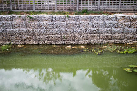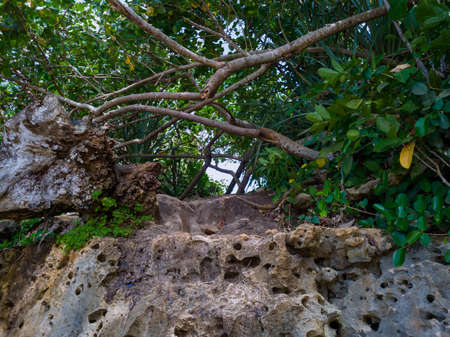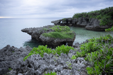 An embankment made of Ryukyu limestone curved like an elephant's nose near the observation deck of the under-sea road on the main island of Okinawa