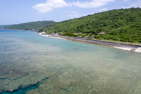 Aerial drone view of the beach at Shashiki, Kunigami-son, Kunigami-gun, Okinawa Island