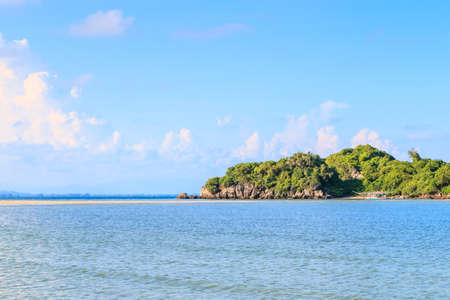 Tropical seascape with sea surface with corals and turquoise clear waters. Blue sky and clouds. Bantayan, Cebu, Philippines.