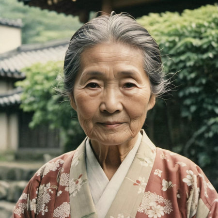 Studio portrait of a graceful senior japanese woman wearing an elegant kimono, showcasing japanese culture and tradition. Ai generative