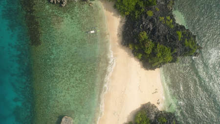 Aerial view of beautiful tropical island with sand beach, azure water. Seascape:Tropical lagoon with turquoise water. Beautiful tropical beach on the island. Philippines. Travel concept.