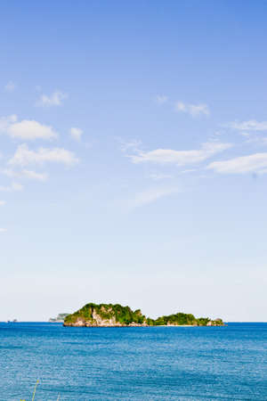 Single rocky island on calm azure blue sea. High horizon, blu sky clodu sky in sunny day. Full frame horizontal crop