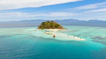 Tropical island Bulog Dos. Tourists walking along the sand bar aerial view.Philippines, Palawan