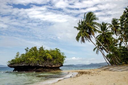 Small tropical island with coconut palm trees and white sand beach. Adventure and travel concept