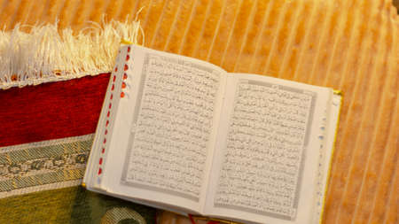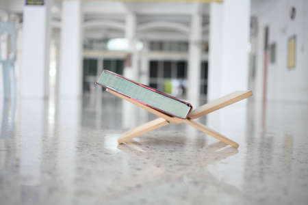 Quran in the mosque - open for prayers The black background of the Muslims around the world placed on a wooden board Quran in the mosque - open for prayers