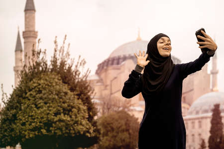 A young smiling Muslim girl in a hijab and stylish black glasses makes.