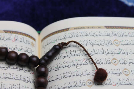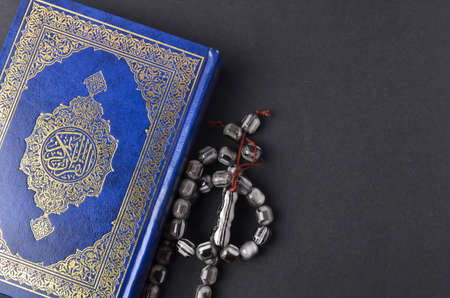 Holy Quran with arabic calligraphy meaning of Al Quran and tasbih or rosary beads