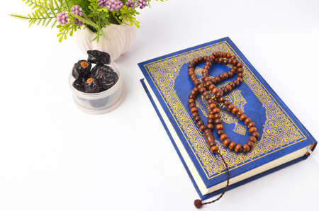 Food Ramadan dry dates or kurma with Quran and rosary. Month fasting culture Muslim and prayer for god, Ramadhan food symbolic eastern Arabian. Islamic concept.