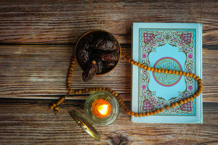 Quran Kareem , wooden rosary , SAFAWI dates on wooden background