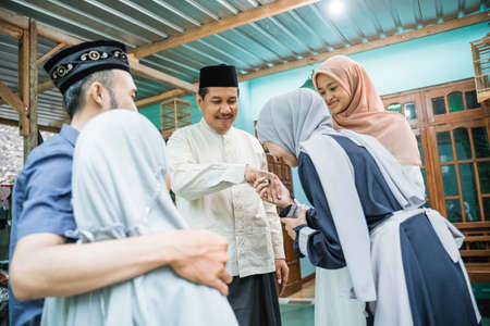 muslim family coming back home and shake their parents hand