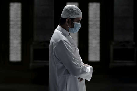 Muslim man with fully traditional white dress praying for Allah, Muslim God, on mosque in ramadan kareem night.
