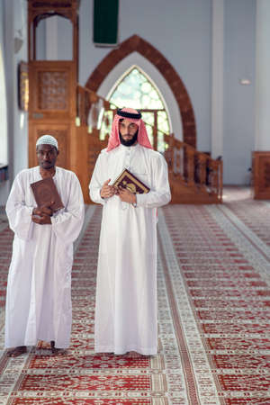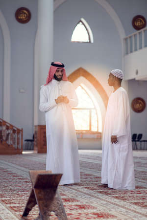 Two religious muslim man walking together inside the mosque