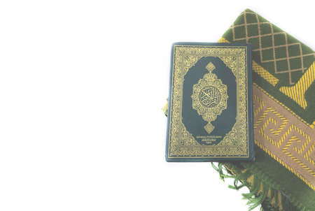 Holy Quran with prayer beads and prayer mat on white background
