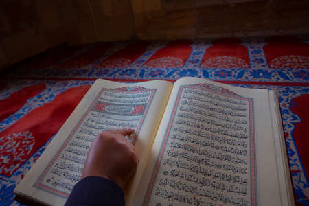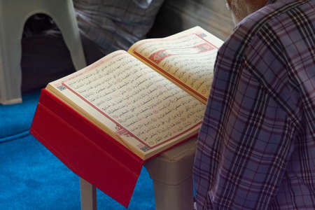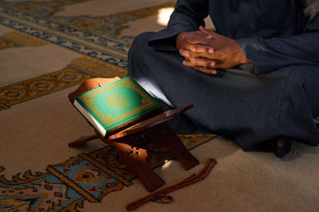 A man reads the holy quran in the mosque. Close-up.