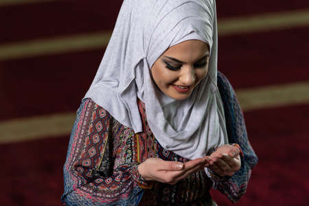Young beautiful Muslim Woman Praying In Mosque.