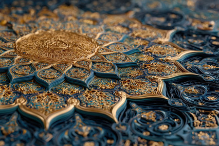Detailed decorative pattern with gold and blue hues, highlighting intricate craftsmanship and artistic design, perfect for cultural themes and visual storytelling