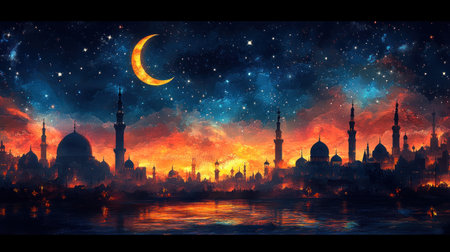 Mystical city skyline at night with crescent moon and starry sky.