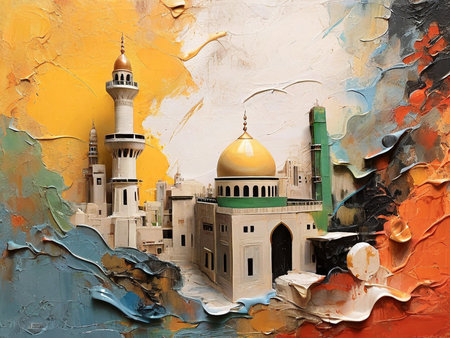 Mosque in the middle of the city. Oil painting style.
