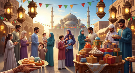 Eid Mubarak greeting card. Muslim family celebrating Eid al-Fitr.