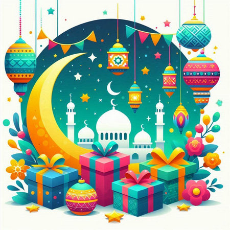 Vector illustration of Eid Mubarak greeting card with mosque, gift box and flowers