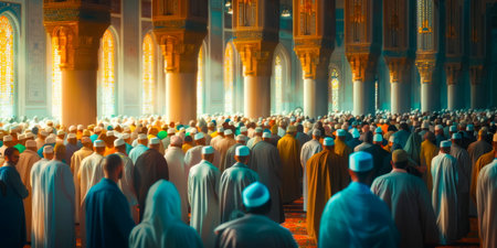 A large group of Muslims gather in a mosque for prayer, a serene and spiritual moment of unity and devotion. The image captures the essence of faith and the importance of community in Islam.