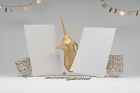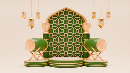 3d Ramadan Kareem podium with golden moon star and lantern, mosque door islamic pattern, arabic coffee pot, date palm fruit, podium as luxury islamic background. decoration for ramadan kareem.