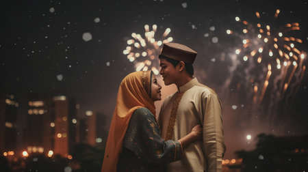 muslim couple looking at fireworks during eid mubarak celebration