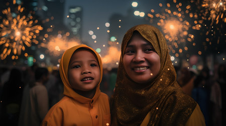 Portrait of muslim mother and her daughter with fireworks in the background