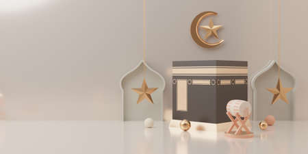 3d rendering mecca pilgrimage kaaba Eid al fitr or ramadan sale banner social media post template flat illustration