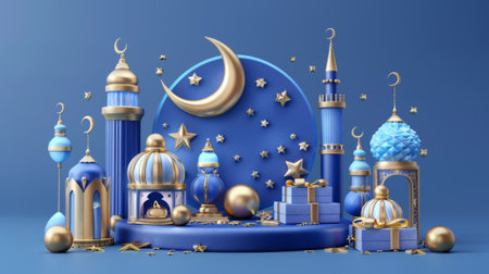 Isolated in 3D on Turkish blue background, this set of Islamic holiday elements includes crescent moon lamps, displays, ornaments, gifts, and geometric decorations.