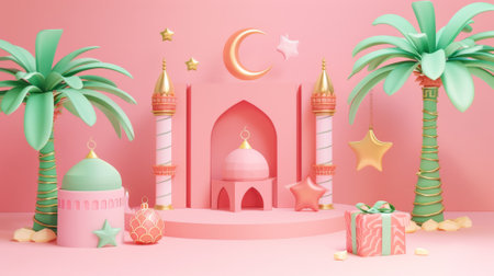 A set of 3D Islamic holiday elements isolated on a pink background. Includes palm trees, gifts, crescent moons, stars, decorations, cylinder display podiums, and mosques.