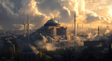 A panoramic view of the famous Hagia Sophia in Istanbul, Turkey, with other historical buildings and architecture visible behind it. The sky is cloudy and dramatic, with sun rays breaking through. There's an atmosphere of history and mystery. In the foreground, there are also some modern urban elements, like skyscrapers. --ar 11:6 --v 6.1 Job ID: c2bc6238-7200-45e8-95c5-974369681f62