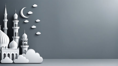 Generative AI illustration of Eid Mubarak background with mosque and clouds in paper cut style