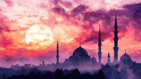 Stunning silhouette of a mosque at sunset, featuring vibrant colors and soft watercolor textures. A serene and picturesque depiction of spirituality and beauty.