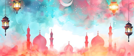 Vibrant Watercolor Eid al Adha Background with Doodle Border Design and Blank Space for Message or Copy Incorporates Glowing Hurricane Lamps Towering Minarets and Grazing Herds in Lush Jade Cerulean