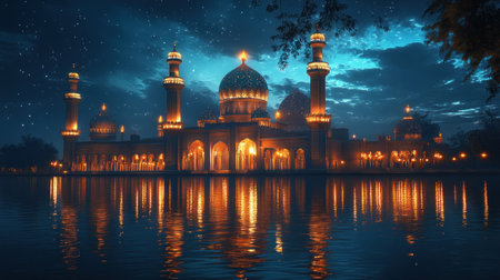 A majestic mosque stands tall against a backdrop of a vibrant sky, illuminated by twinkling stars and reflecting in the still waters of a calm lake.
