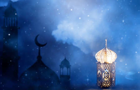 Ramadan Kareem background. Ornamental Arabic lantern glowing at night
