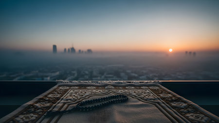 Prayer mat and tasbih beads on balcony with city skyline and sun rising through morning fog
