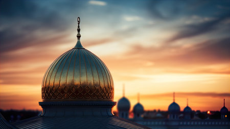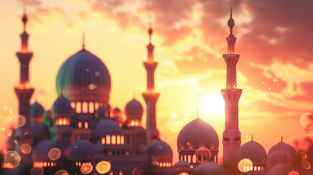 mosque at sunset, with minarets and domes adorned with Eid decorations. Generative AI